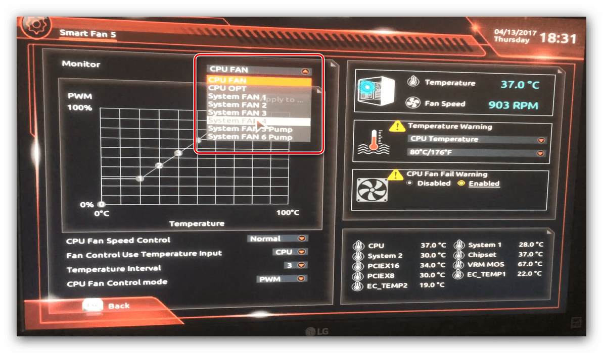 Также в платы рассматриваемого производителя встроено средство защиты компонентов компьютера от перегрева: при достижении порогового значения температуры пользователь получит оповещение о необходимости выключения машины. Настроить отображение этих уведомлений можно в разделе «Smart Fan 5», упомянутом на предыдущем этапе.