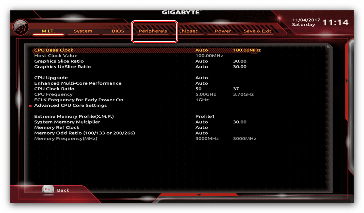 Через UEFI BIOS плат Gigabyte можно настроить работу компьютера с видеоадаптерами. Для этого перейдите на вкладку «Peripherals».
