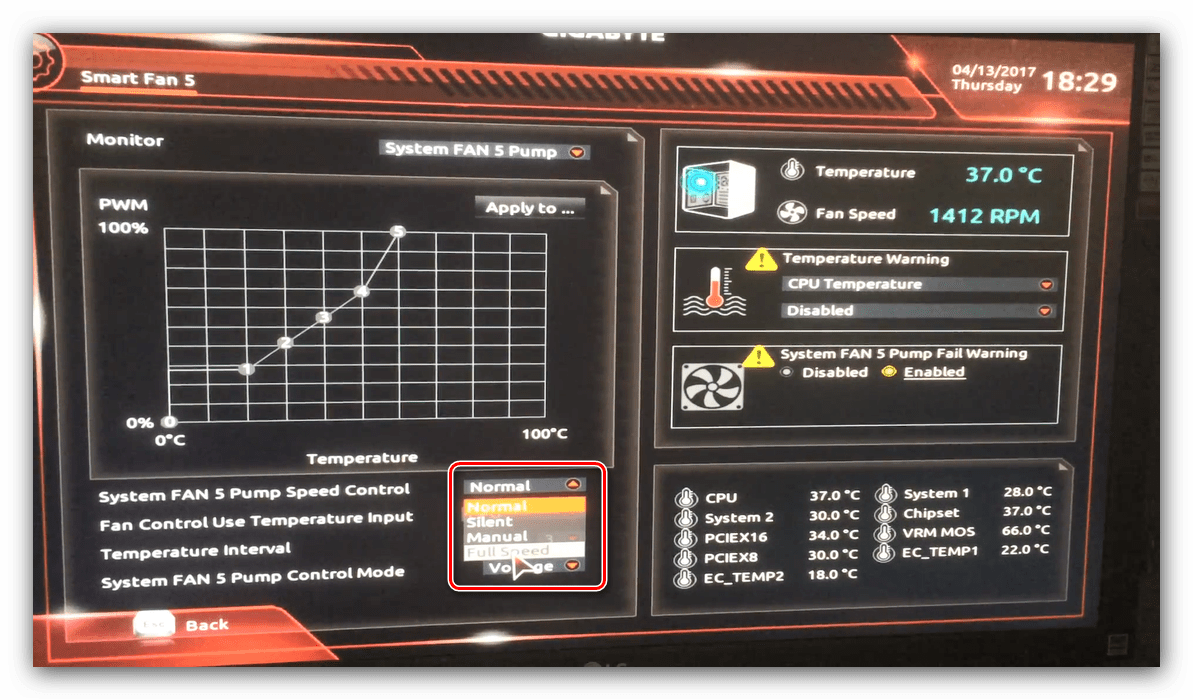 - Отрегулировать скорость вращения кулера, корпусных вентиляторов. Без знаний менять данный параметр не рекомендуется.
