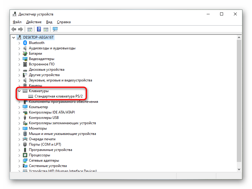 Разверните блок «Клавиатуры» — в нем должны отсутствовать предупреждающие знаки, поскольку такие проблемы переустановка далеко не всегда исправляет, стоит это взять во внимание. Итак, нажмите ПКМ по строке «Стандартная клавиатура PS/2».
