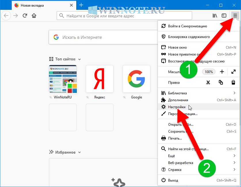 Откройте меню настроек браузера Firefox, для этого нажмите кнопку Открыть меню и выберите пункт Настройки .