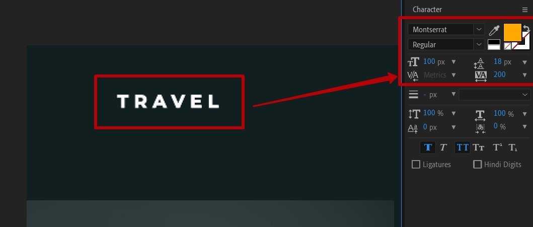 Теперь переключитесь в After Effects, на панели инструментов выберите Horizontal Type Tool и в рабочей области композиции около логотипа наберите слово Travel.