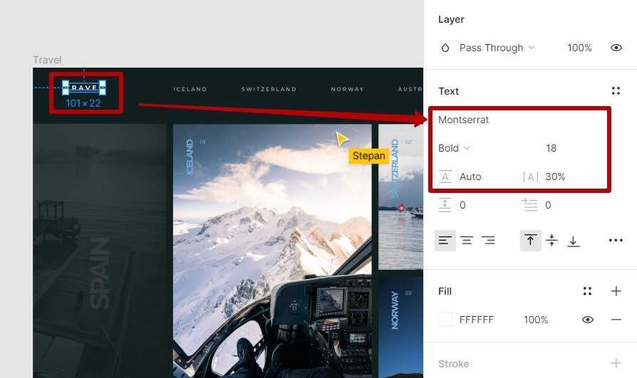 Настройте значения текста — гарнитуру шрифта, размер и межбуквенный интервал, как в Figma, — и переместите на место логотип.