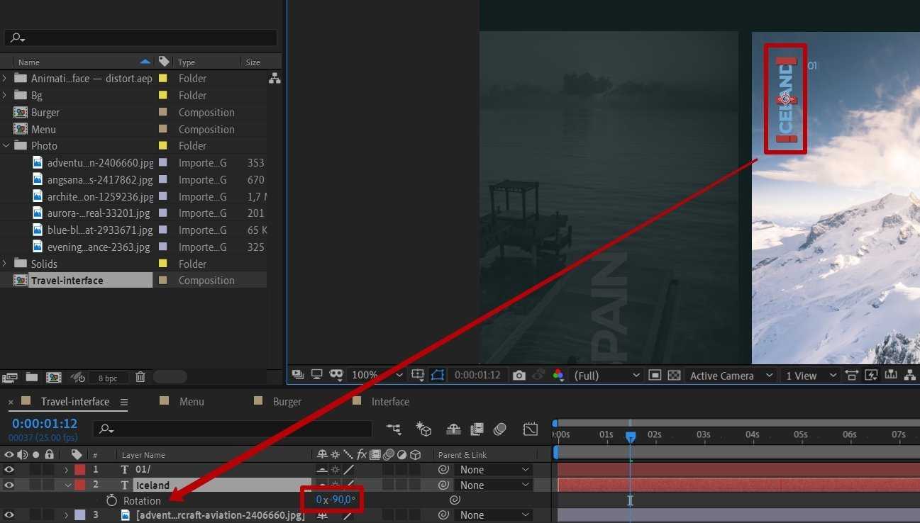 Про перенос шрифтовых элементов мы уже проговаривали чуть выше — по аналогии перенесите надписи к фотографиям. Единственное отличие от того же меню — в том, что надписи вертикальные. Чтобы развернуть текст на 90 градусов, точнее на –90, выберите нужный слой на Timeline, нажмите клавишу R, что означает Rotation, и укажите значение –90. Вот так: