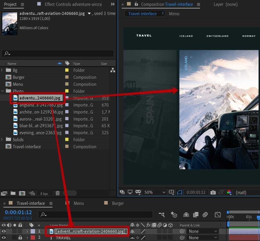 Остальные фотографии формируются подобным образом: переносите на Timeline, грубо подгоняете на панели композиции и делаете финальную подгонку маской при выделенной фотографии.