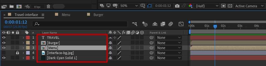 Панель Timeline: логотип, композиция Burger, композиция Menu, подложка для переноса макета, фон заливки