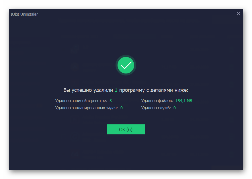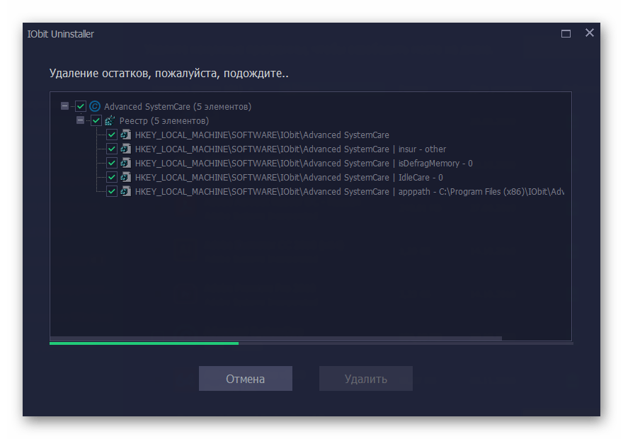В IObit Uninstaller следите за тем, как происходит удаление ключей реестра и других элементов софта.
