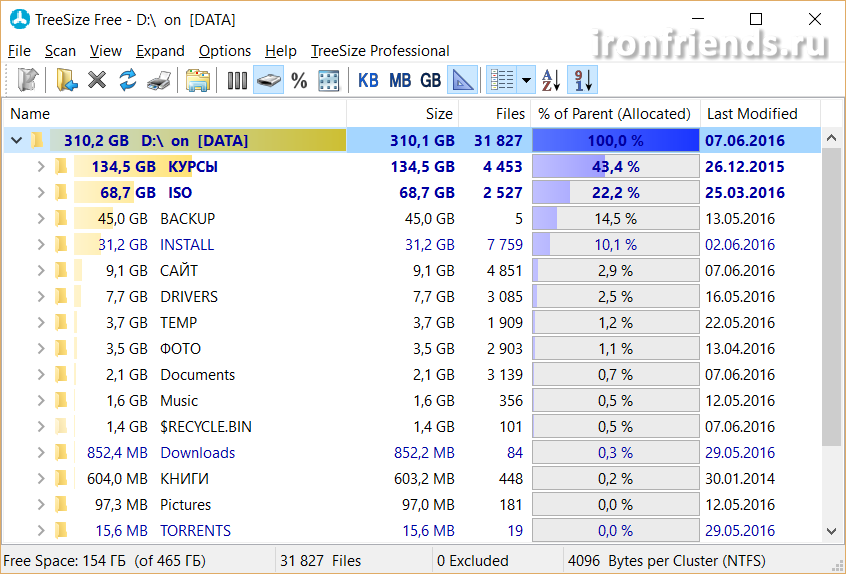 После запуска программа просканирует ваш диск, определит размеры файлов, папок и отсортирует их по размеру.