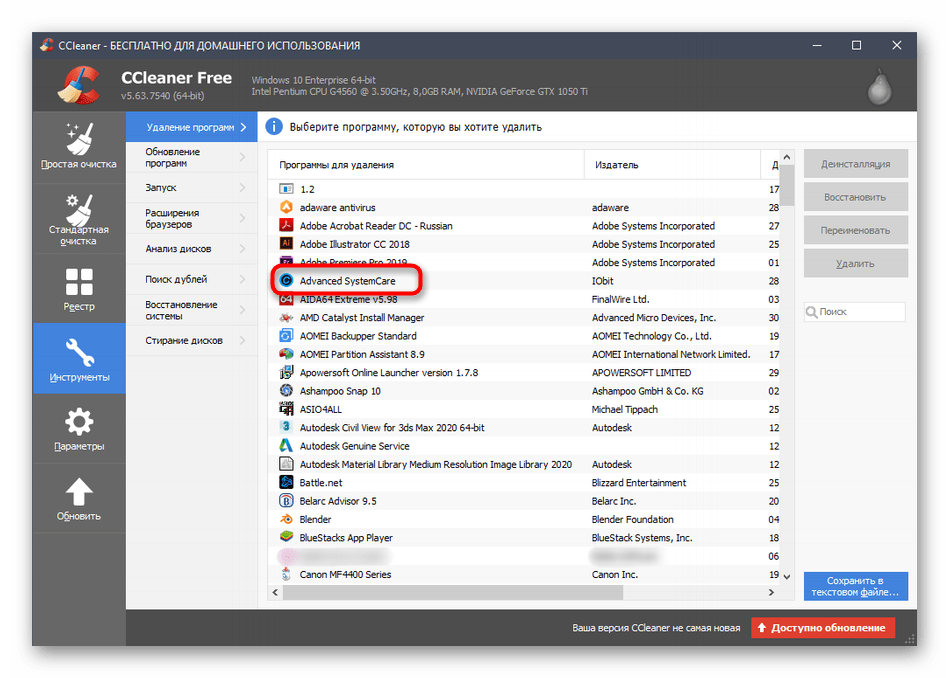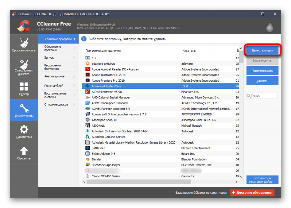 CCleaner — одна из самых популярных вспомогательных программ для Windows, функциональность которой сосредоточена на очистке мусора, исправлении реестра и других действиях с ОС. В ней есть отдельный инструмент, позволяющий деинсталлировать софт, а управление им происходит так: