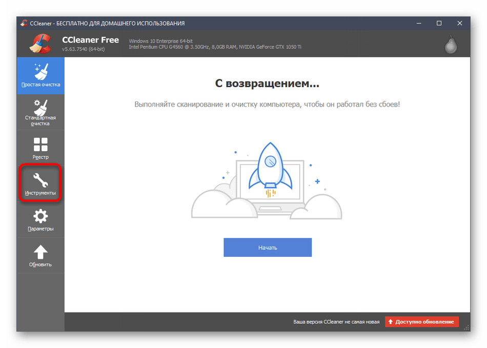 - Запустите CCleaner, а затем через меню слева перейдите в «Инструменты».