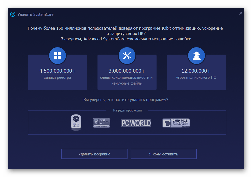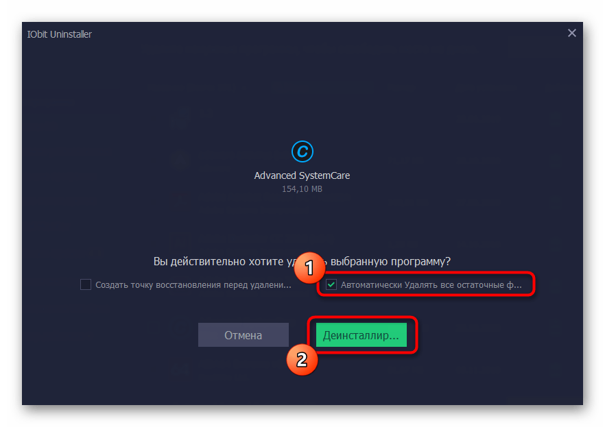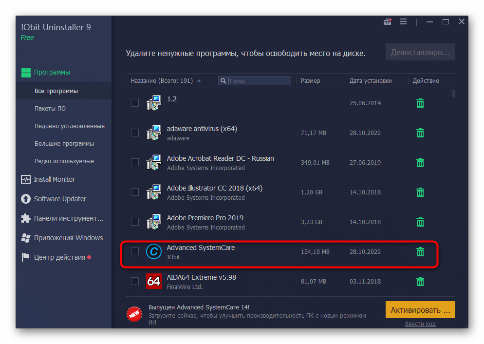 Программы IObit Uninstaller и Advanced SystemCare создал один и тот же разработчик, но решение для удаления софта пользуется большей популярностью из-за наличия встроенной опции по быстрой очистке остаточных файлов. Как раз ее мы и упомянем далее, разбирая деинсталляцию SystemCare.