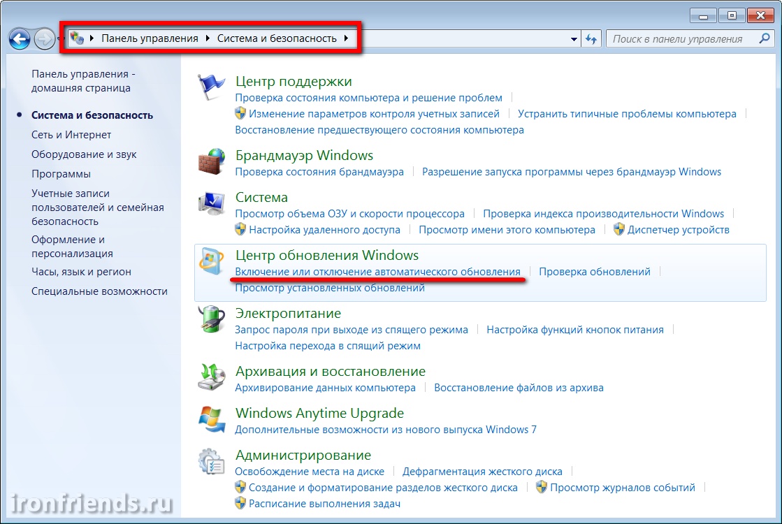 В Windows 7 кликните левой, а в Windows 8.1 правой кнопкой мыши на значке Windows и перейдите в меню «Панель управления / Система и безопасность / Включение или отключение автоматического обновления».