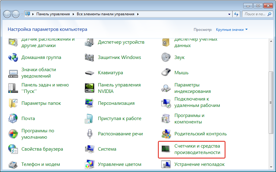 - Выбрать пункт «Счетчики и средства производительности».