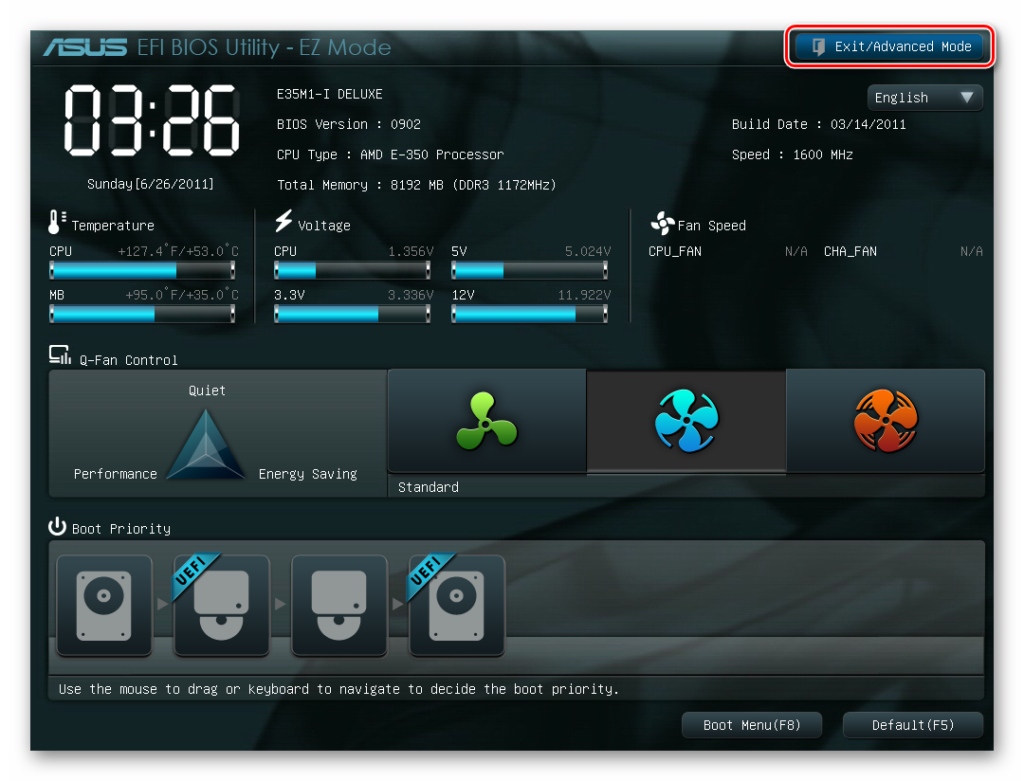 Функционал в этом наборе программ намного мощнее обычного БИОСа. Кроме удобного и визуально понятного интерфейса в запущенной UEFI можно управлять мышкой. Мультиязыковая система позволяет выбрать любой язык, в том числе и русский. У нее также имеется возможность выйти в интернет, не загружая компьютера. Устанавливается она на новых машинах и работает только с последними версиями операционных систем. В опциях этого BIOS можно легко настроить загрузку с диска или с флешки.