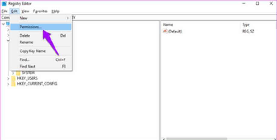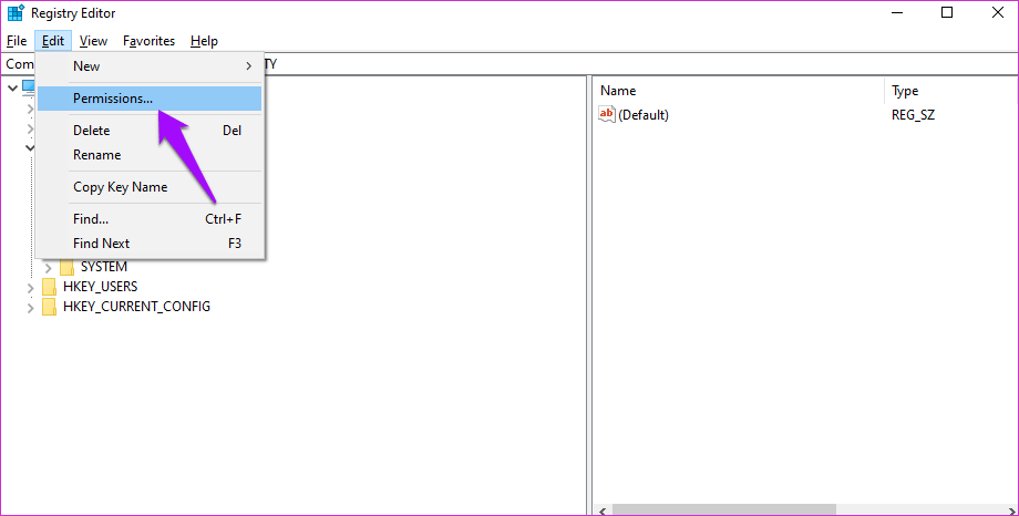 Снова откройте редактор реестра и нажмите «Разрешения» в разделе «Правка».