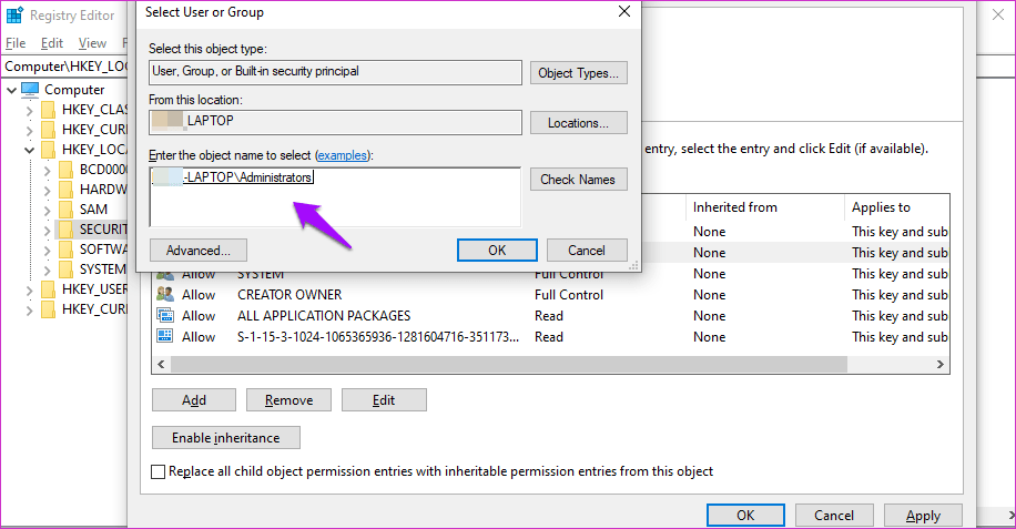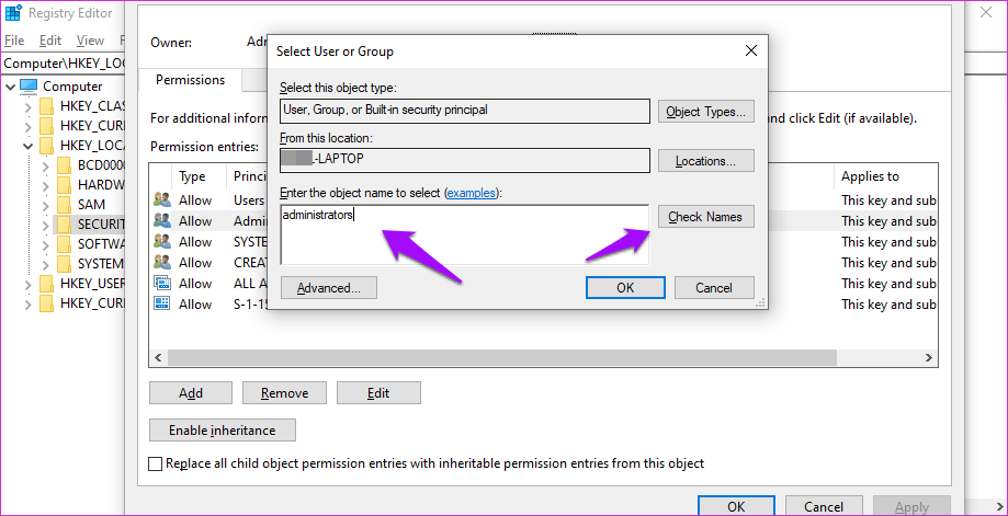 Введите administrators (во множественном, а не в единственном числе что вызовет еще больше ошибок) в поле «Имя объекта для выбора» и выберите Проверить имена для проверки целостности.