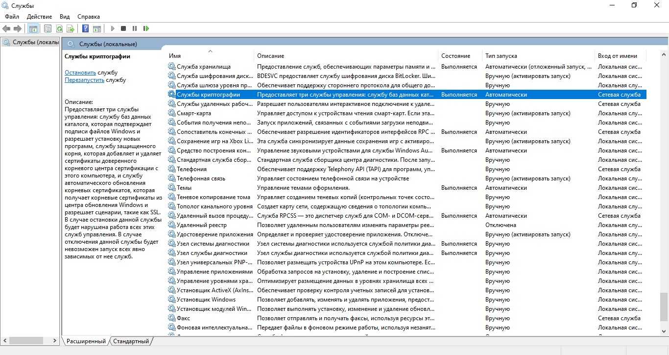 2. В списке найдите и выделите пункт «Службы криптографии», и в левой части окна нажмите «Остановить».