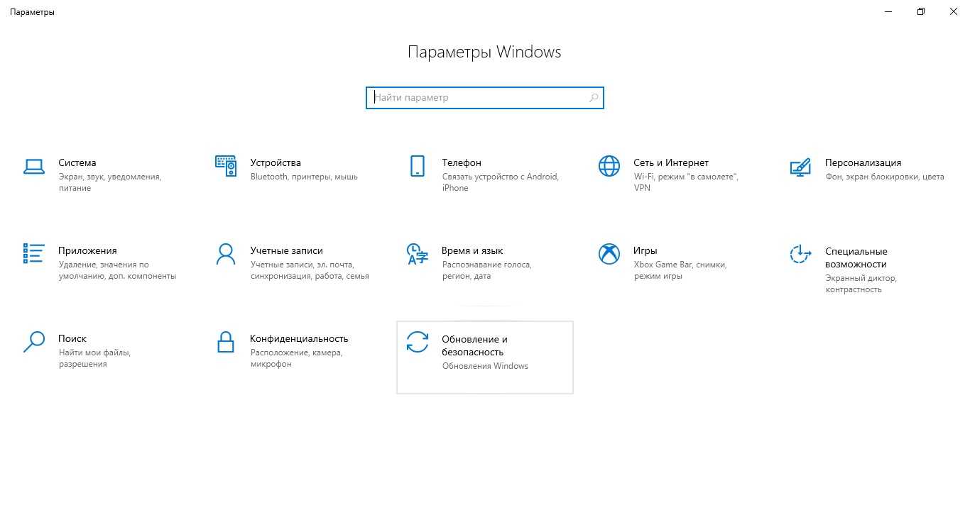 1. Откройте меню «Пуск» и перейдите в раздел «Параметры». Найдите блок «Обновление и безопасность».