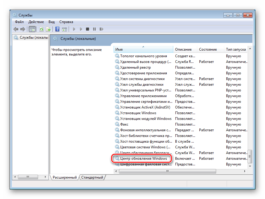 Служба «Центра обновлений» имеет свойство работать со сбоями в силу различных причин. Решить проблему поможет ее перезапуск в соответствующей оснастке.