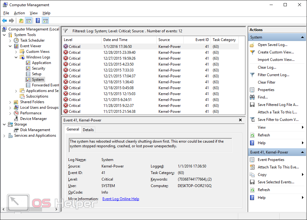 В логах данной ошибки можно найти описание, которое выглядит следующим образом: «Система перезагрузилась, не завершив полностью работу. Эта ошибка может быть результатом того, что система перестала отвечать, произошел критический сбой, или неожиданно отключилось питание». Однако такое описание абсолютно не даёт подсказки о причинах возникновения системного сбоя.