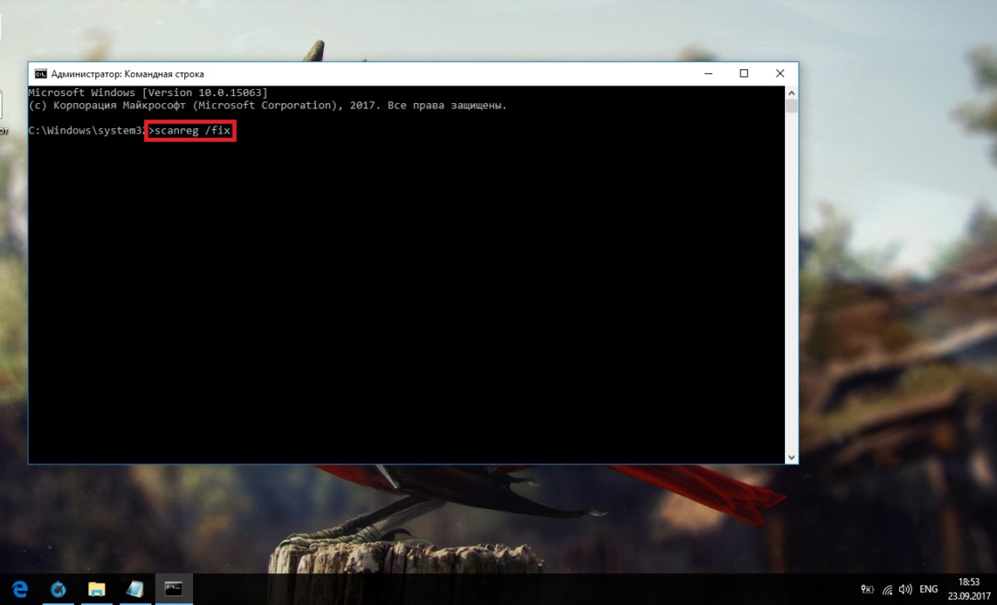 Введите команду scanreg /fix для проверки реестра через встроенную утилиту Windows 10