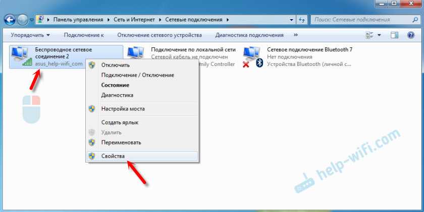 Дальше необходимо открыть «Свойства» (нажав правой кнопкой мыши) адаптера, параметры которого нужно сменить. Если подключение по кабелю, то это «Подключение по локальной сети«, а если по Wi-Fi – «Беспроводное сетевое соединение».