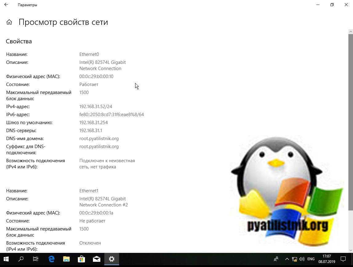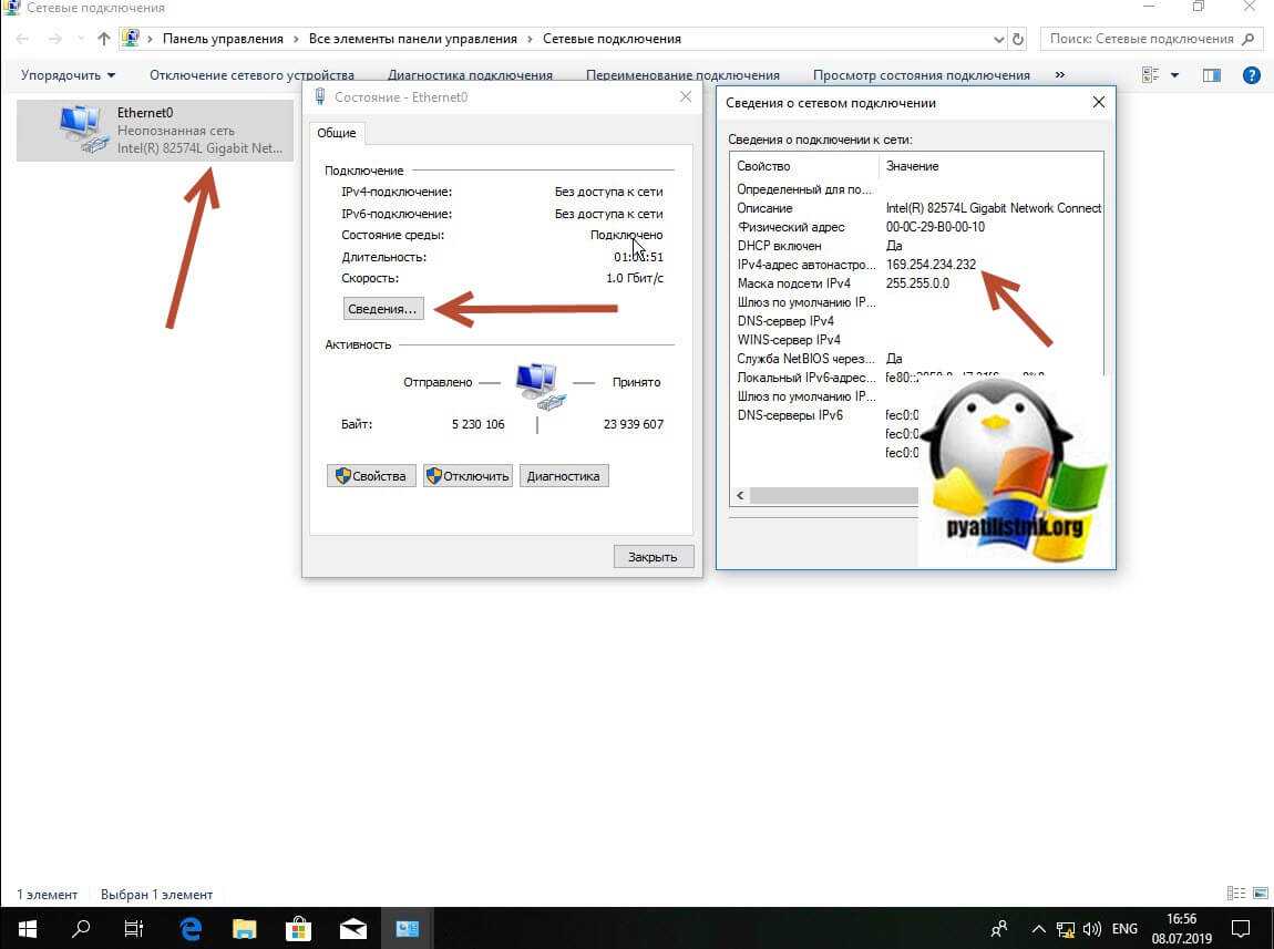 У вас будет список ваших сетевых подключений, в моем примере я вижу Ethernet0 и у него неопознанная сеть, если зайти в сведения адаптера, то вы увидите, что он не смог найти DHCP сервер и получил IP-адрес из диапазона APIPA.