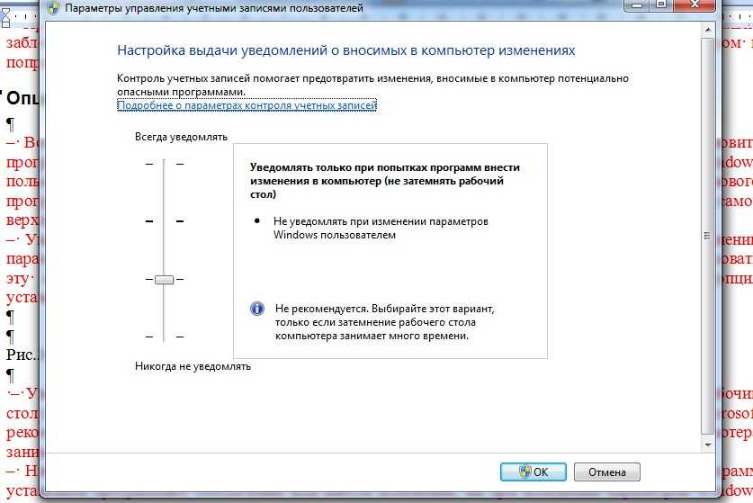 - Режим «Уведомлять только при попытках приложений внести изменения в компьютер (не затемнять рабочий стол)»