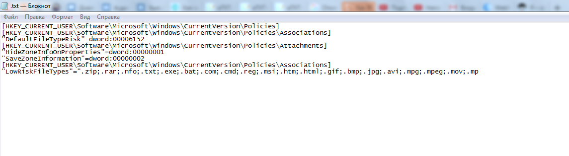 3. Далее, нам необходимо подкорректировать сам Реестр, дабы нам вовсе перестали докучать различные предупреждения, не только с exe файлами, но и с другими форматами. Создайте текстовый документ под название «*.txt» и напишите в нём весь тот скрипт, что представлен на картинке ниже: