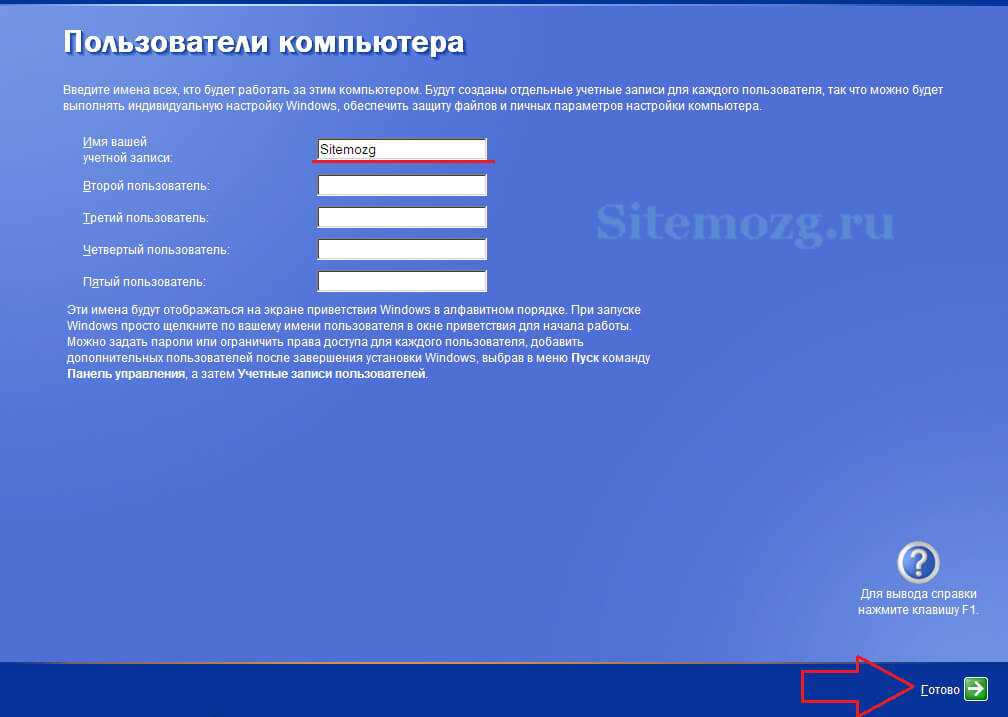 11) Введите название учётной записи. Должна быть минимум 1. И нажмите Готово.