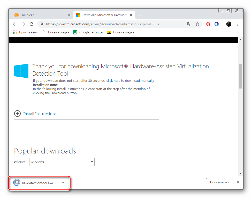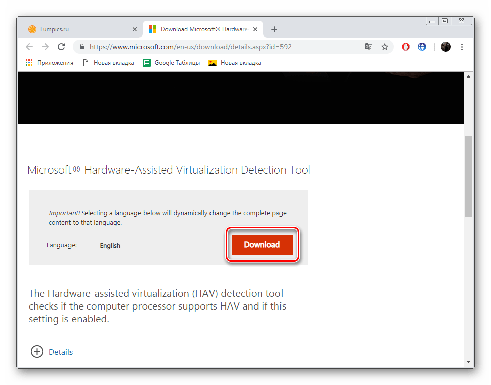 - Перейдите на официальную страницу загрузки Hardware-Assisted Virtualization Detection Tool и нажмите на кнопку «Download».