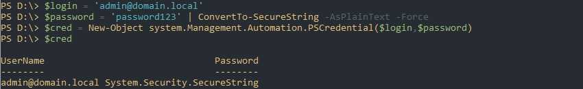 В Powershell есть команда ConvertTo-SecureString, которая может преобразовывать обычные строки в объект SecureString. Результатом команды будет такой же объект, который был у команды Get-Credential , свойства ‘Password’: