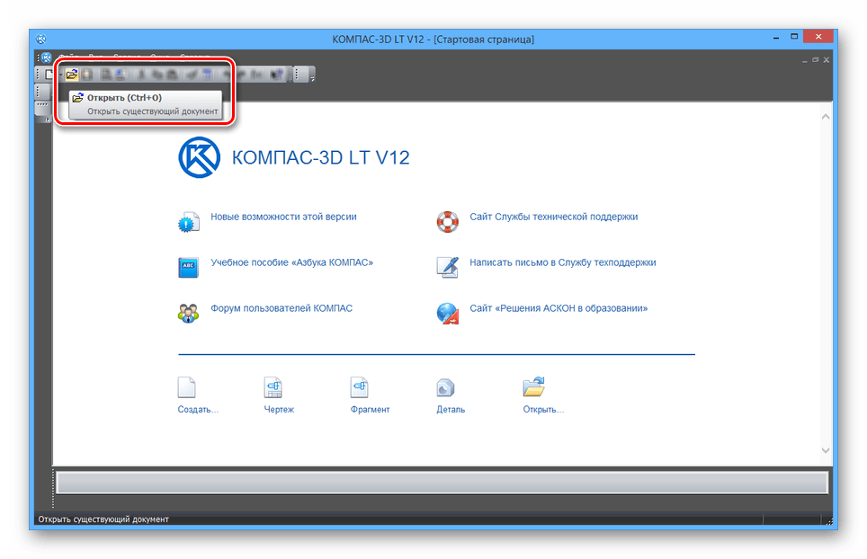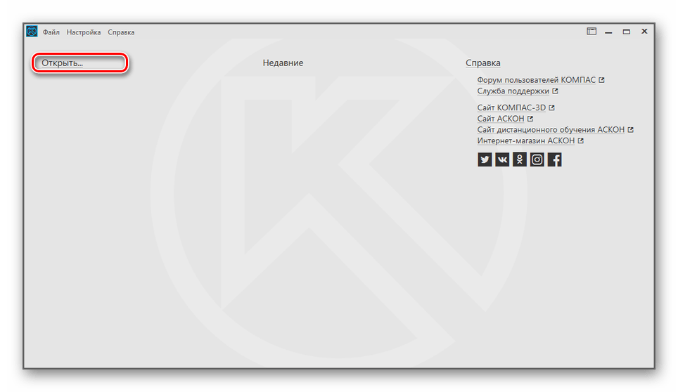 - Воспользуйтесь ссылкой «Открыть» в левой части интерфейса КОМПАС-3D Viewer.