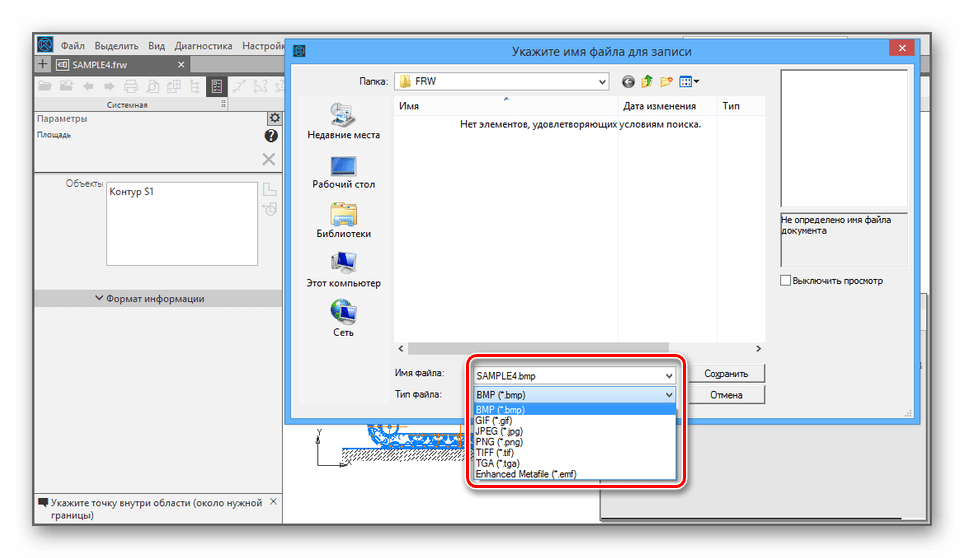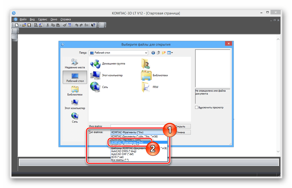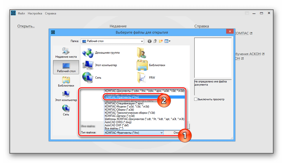 Измените значение в блоке «Тип файлов» на «КОМПАС-Фрагменты».