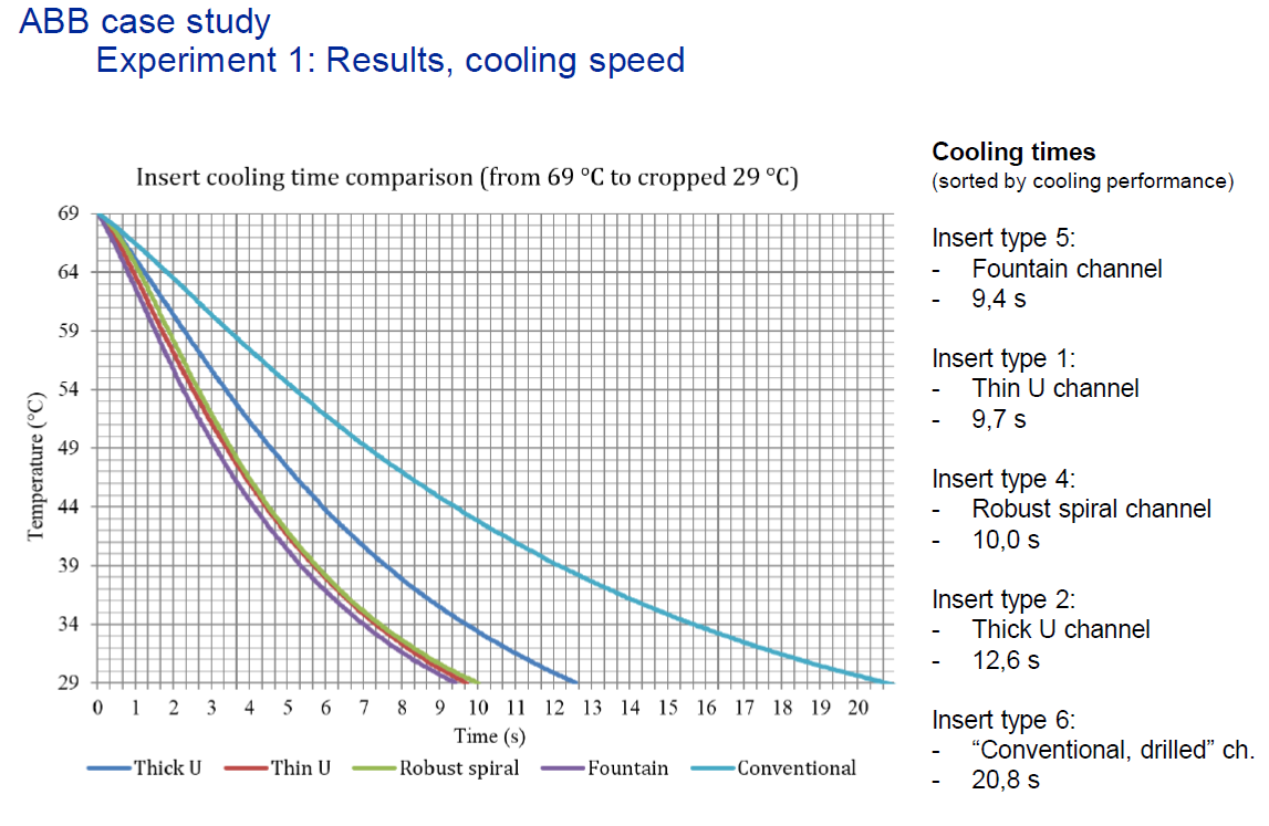 Такие детали, как колпачки-уплотнители для электрических разветвителей традиционно производятся на литьевых машинах с пресс-формами. При необходимой для формования температуре в 30°С во время производства пресс-формы нагреваются до 70°С, что требует дополнительных затрат времени для остывания пресс-формы, из-за чего производственный цикл составляет 20,8 с. Для сокращения этого периода были разработаны и изготовлены вставки в пресс-формы с внутренними каналами охлаждения. С этой целью использовалась технология селективного лазерного плавления.
