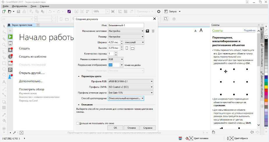 Размер создаваемого файла выставьте тот же что и у импортируемого растрового изображения или больше, режим основного цвета и профиль выберите RGB , разрешение оставьте 300 точек на дюйм.