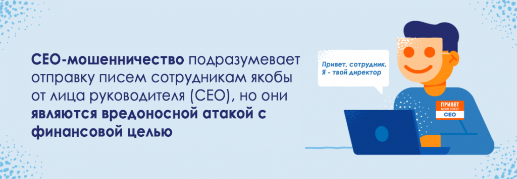 CEO-мошенничество – это форма фишинга, при которой злоумышленник получает доступ к учетной записи электронной почты высокопоставленного руководителя (например, генерального директора). Имея в своем распоряжении скомпрометированный аккаунт, кибер-преступник, выдавая себя за генерального директора, отправляет электронные письма сотрудникам организации с целью осуществить мошеннический банковский перевод или провести ряд других незаконных действий.