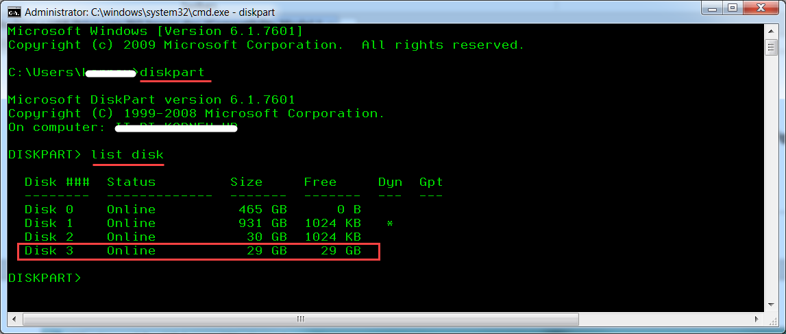 Отступление: как определить какой диск соответствует вашей флэшке? Для этого можно воспользоваться утилитой diskpart