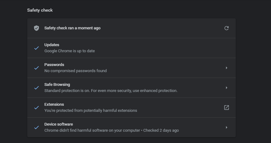 Google вдобавок непременно сообщит вам, когда один из ваших паролей будет скомпрометирован, а затем поможет поменять его. Вы можете осуществить проверку безопасности вручную из меню опций Chrome. В разделе «Настройки» перейдите в подраздел «Проверка безопасности», а затем выберите параметр «Выполнить проверку». Программа активизирует поиск обновлений безопасности, проверит себя на факт вероятных утечек данных и некорректной работы расширений.