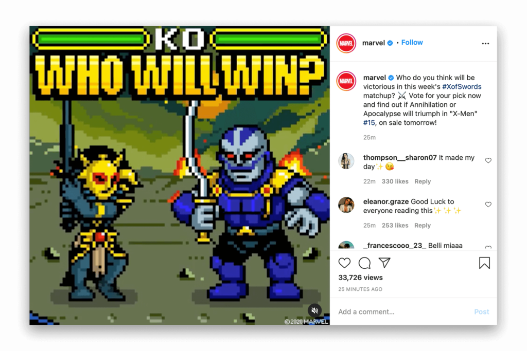 Ну или вот — пример от Marvel. Создали опрос на тему того, кто, по мнению подписчиков, победит в поединке. Плюсом к этому сделали анонс.