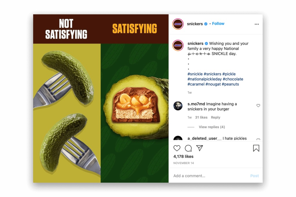 Вы знали, что 14 ноября — международный день соленых огурчиков? Вот ребята в Snickers знали. Посмотрите, какой вовлекающий пост в Инстаграм они сделали.