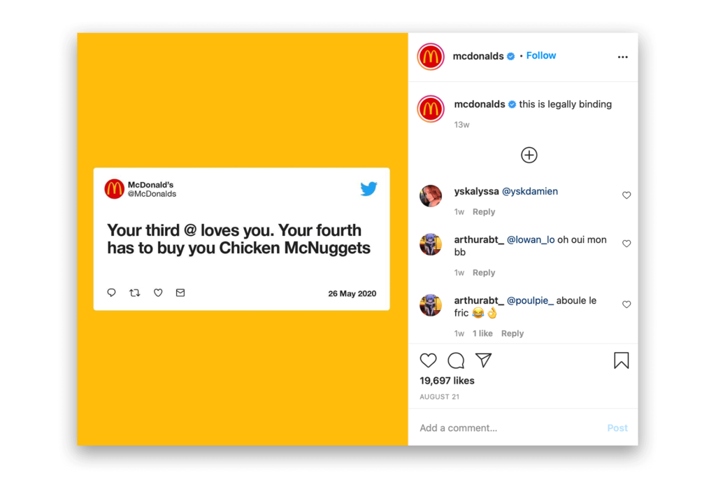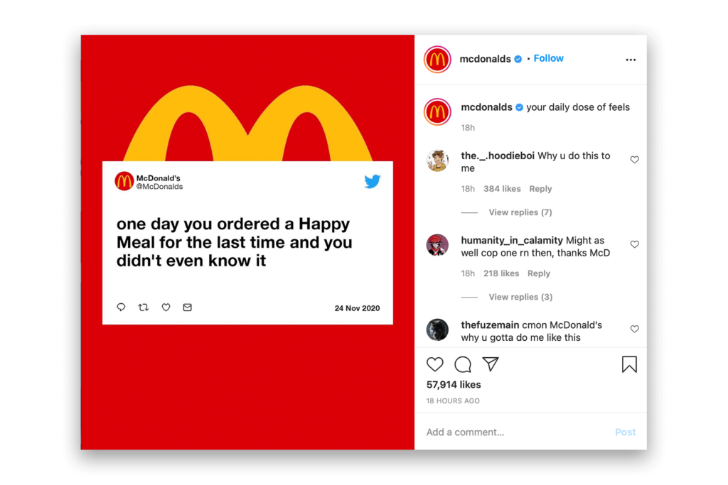 Взгляните, как сделал McDonalds. Скрин публикации с Твитера на фоне логотипа — и вот, хороший вовлекающий пост.