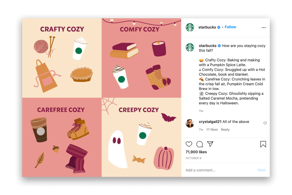 Ниже пример от Starbucks. На картинке расположены основные элементы — варианты ответов. А в тексте описание каждого варианта и вопрос. Делайте так же.