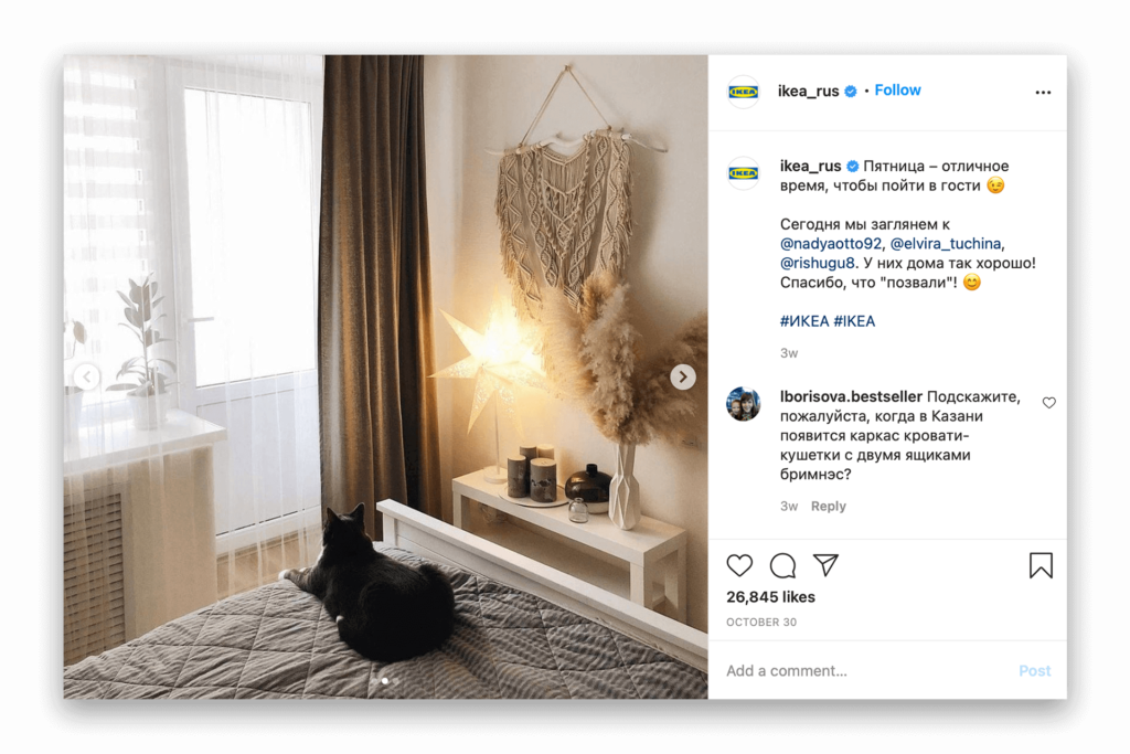 Но для этого не обязательно продавать одежду. Посмотрите на публикации в Инстаграме IKEA — они выкладывают интерьеры подписчиков, в которых присутствует мебель бренда.