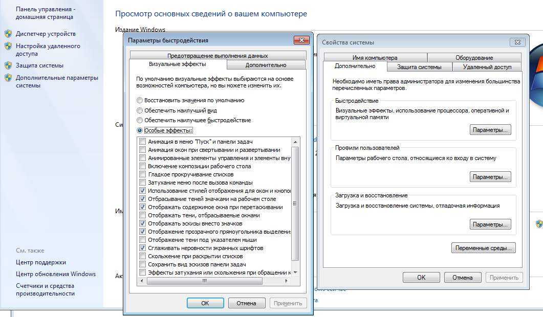 В свойствах системы выбираем Дополнительно — Быстродействие — Параметры.