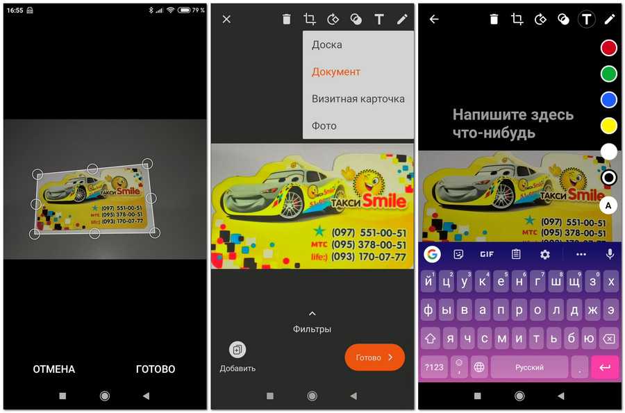 Пресет «Фото», как видим из названия, лучше всего подходит для сканирования фотографий. Пресет «Визитная карточка» создан для визиток, буклетов, прочей цветной фотопечати. Пресет «Документ» заточен под улучшение читабельности документов. Пресет же «Доска» можно использовать в самых тяжёлых случаях, чтобы привести в читабельный вид потёртые, мятые или рукописные бумажки, этот пресет убирает фон и делает изображение контрастным. Но какой из пресетов подойдёт лучше в каждом из случаев – это, безусловно, покажет только его применение по факту. Пресеты заточены под определённые размеры автоматической обрезки сканируемых бумажек. А ещё у каждого из пресетов есть свои несколько фотофильтров для наложения.