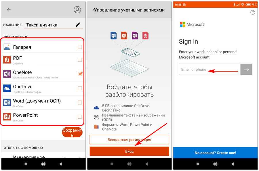 После завершения редактирования жмём внизу кнопку «Готово», и нас выбрасывает на этап сохранения снимка. Здесь можем сохранить отсканированную бумажку как обычное фото или как файл PDF в памяти Android-устройства. Либо же можем сохранить в другой формат контента и отправить в один из сервисов Microsoft. В числе последних – обычные фото и файлы PDF с выгрузкой в облачное хранилище OneDrive, файлы документов Microsoft Word и PowerPoint с выгрузкой в то же хранилище OneDrive, а также оформление в виде заметки и отправка в сервис заметок OneNote. Отдельно стоит отметить возможность сохранения в формат документа Word: в него отсканированная бумажка поступит не как вставленный в документ снимок, а как распознанный технологией OCR текст. Для выгрузки снимка в OneDrive или OneNote в приложении Office Lens нужна, соответственно, авторизация с помощью аккаунта Microsoft.