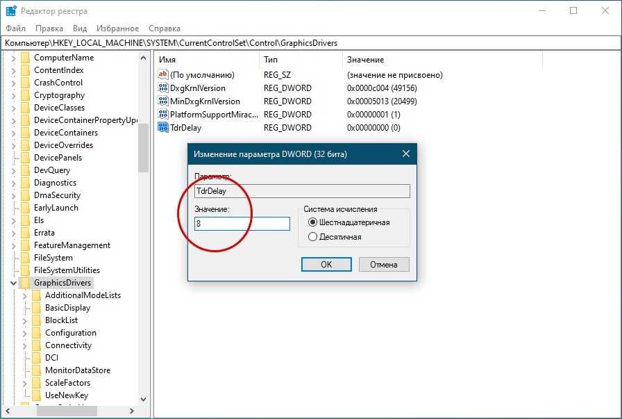 На слабых компьютерах с проблемами производительности операционной системы неполадка может быть вызвана зависанием драйвера видеокарты. В этой ситуации можно попробовать принудительно увеличить время отклика драйвера графической карты, применив простой твик реестра.