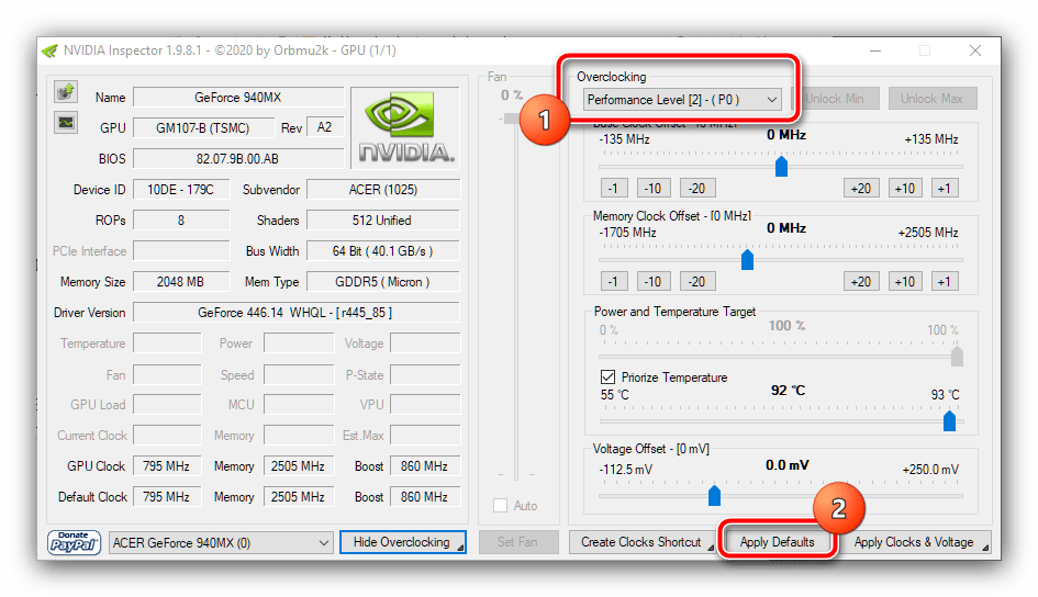 После появления продвинутых настроек в выпадающем меню «Overclocking» выберите вариант «Performance Level — (P0)», если установлен какой-либо другой, затем щёлкните по пункту «Apply Defaults».