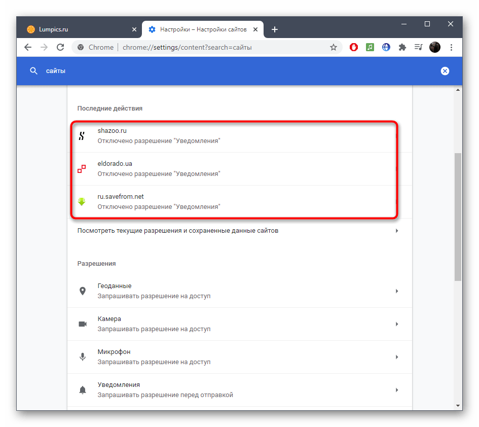 Чаще всего появление рекламы в нижнем правом углу рабочего стола провоцируют уведомления, добавленные в браузер из разных сайтов. Пользователи самостоятельно нажимают по кнопке «Разрешить» при появлении соответствующего уведомления, после чего настройки сохраняются. В результате время от времени всплывает реклама, связанная с тем или иным сайтом. Избежать этого можно, если запрещать показ уведомлений, однако если они уже добавлены, придется очистить список разрешений, о чем и говорится в другой статье на нашем сайте на примере браузера Google Chrome.
